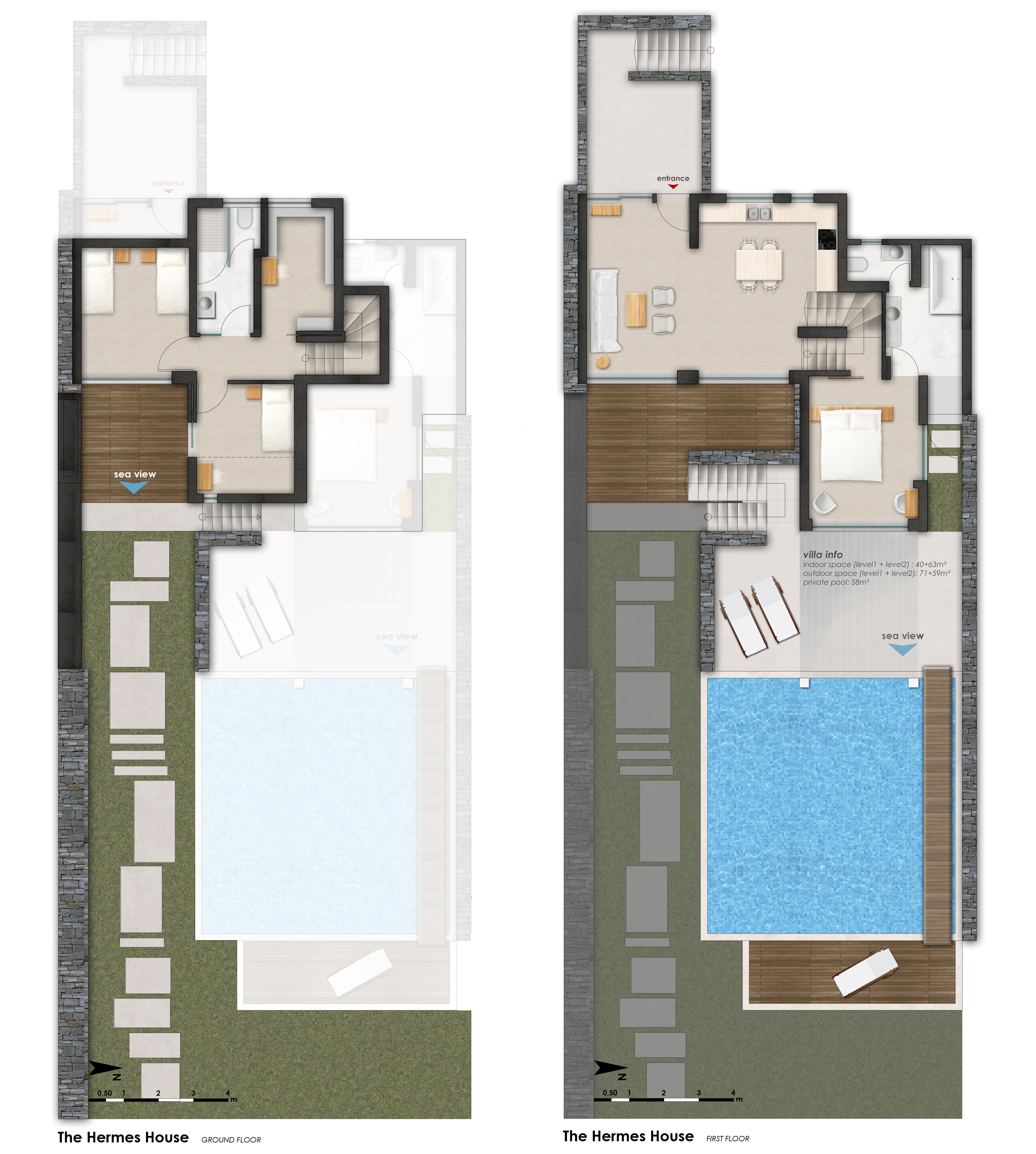 Собственный панорамный бассейн: ± 58 кв. м. (с подогревом в Апреле, до середины Мая и в конце Октября)